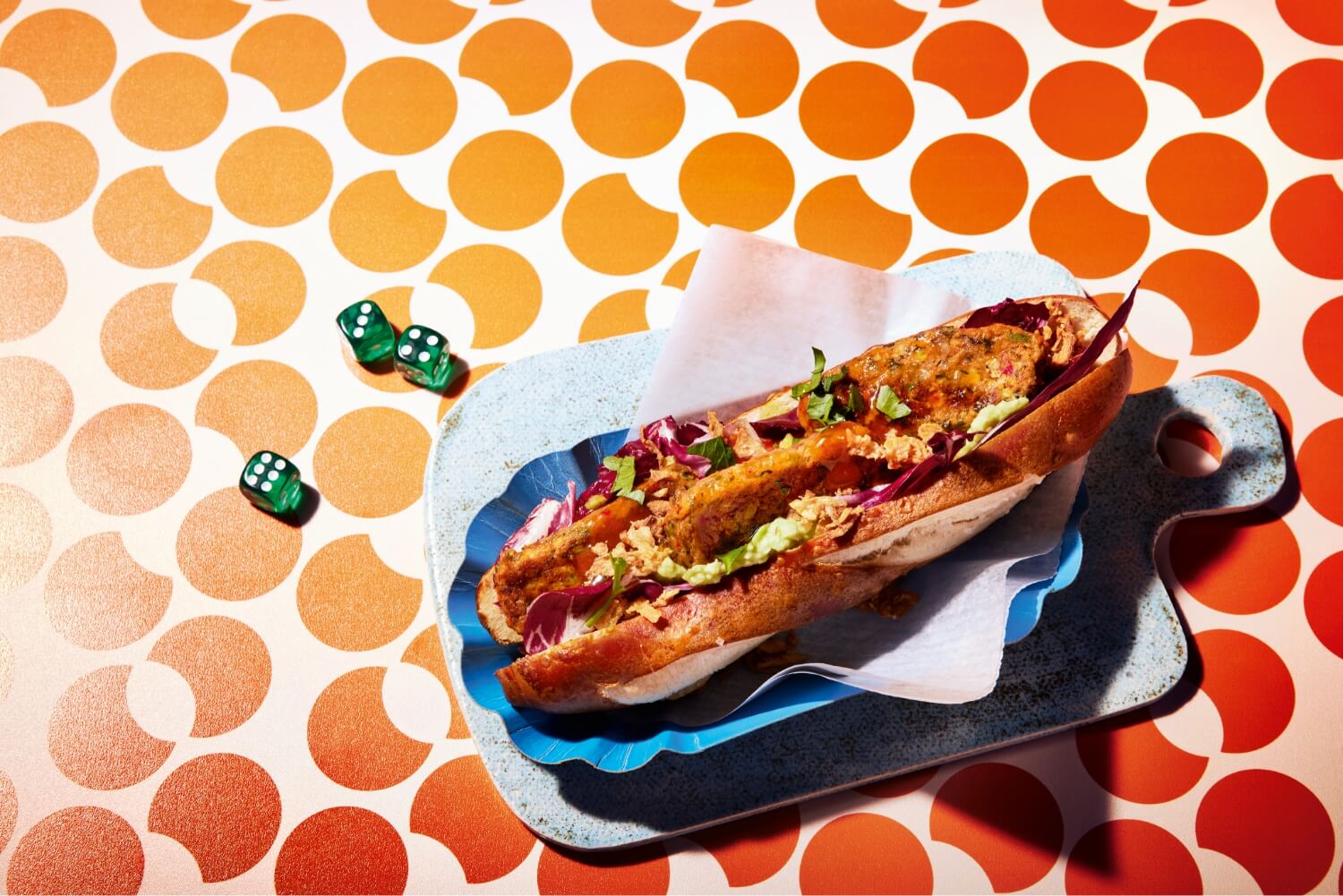 Snijd het pretzelbroodje horizontaal open en bestrijk beide helften met avocadocrème. Beleg de onderste helft met sla, Linsen Grinsen, curry en gebakken uitjes en bedek met de bovenste helft.